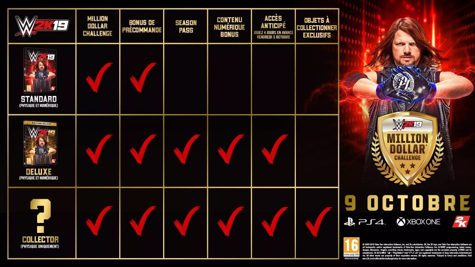 Pour le reste, on imagine que l’ensemble sera une nouvelle fois limité et numéroté à 30 000 exemplaires et on croise les doigts pour qu’elle renferme une figurine un peu plus sympa que le action man de John Cena. Sinon d’ailleur, rien ne dit que le contenu du collector sera dédié à A.J Styles la superstar qui à l’honneur de figurer sur les jaquettes de l’édition standard et gold cette année. Car 2K réserve peut être une nouvelle fois le collector à une autre star avec pourquoi pas Ronda Rousey vu qu’elle est déjà prévue en personnage jouable offert en bonus de pré-commande. L’idéal aurait été un hommage à Big Van Vader qui vient tout juste de nous quitter, mais j’ai peur que ce soit trop juste pour faire quelques chose cette année :/