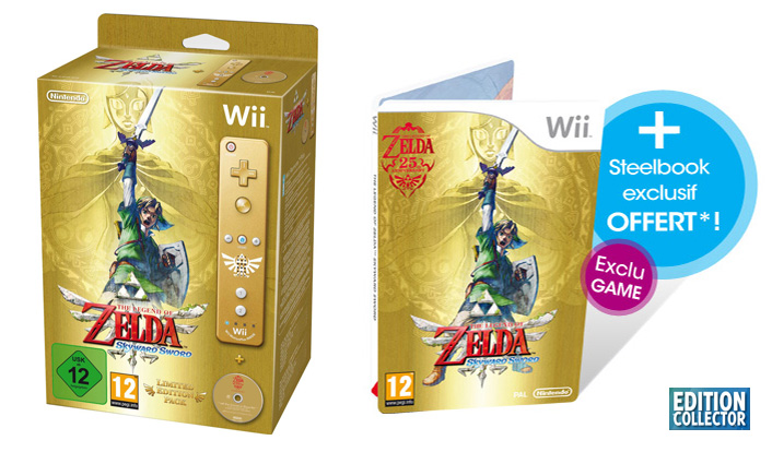 Sorti depuis quelques jours dans toutes les bonnes crèmeries le très attendu The Legend of Zelda Skyward Sword est aussi vendu dans une édition collector. Encore disponible sur Amazon.fr autour de 65€ cette édition renferme en plus du jeu un CD audio des musiques de Zelda en version orchestrale, mais surtout une magnifique Wiimote dorée ornée du blason hylien. Si vous n’avez pas encore craqué pour ce nouveau Zelda, sachez que l’enseigne Game propose en exclusivité un boitier steelbook offert ainsi qu’un code pour télécharger la version remasterisé sur 3DS du jeu The Legend of Zelda Four Swords. Part contre connaissant la réputation du site Game.fr je vous conseille vivement de faire votre achat en magasin plutôt que sur leur site internet. ![]()