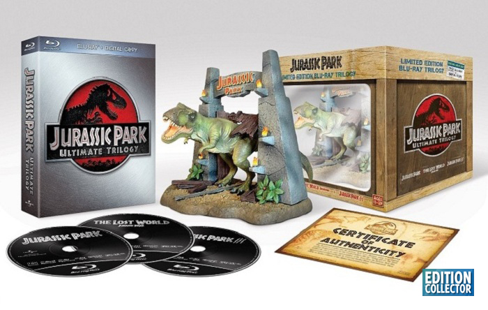 C’est le 25 octobre prochain que sortira l’une des plus célèbres licence du cinéma toujours très attendus par les amateurs du support bleu : la trilogie Jurassic Park! Universal sortira pour l’occasion une édition collector au tarif toujours inconnu. En plus des 3 films complètement remastérisés accompagnés de leurs copies numériques et des moult bonus déjà présent dans les versions DVD, vous trouverez une réplique du T-Rex défonçant l’entrée du parc.