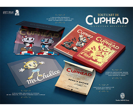Celle-ci contiendra l’artbook collector avec en bonus un fourreau cartonné avec dorure à chaud, 3 celluloïds reprenant le design de l’écran-titre du jeu dans un portfolio cartonné ainsi que 2 celluloïds exclusif à l’effigie de Ms Chalice le tout accompagné d’un certificat d’authenticité numéroté à 500 exemplaires !