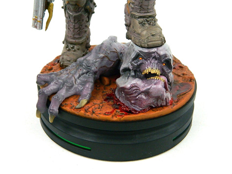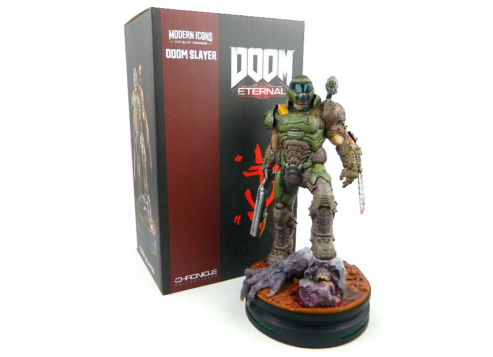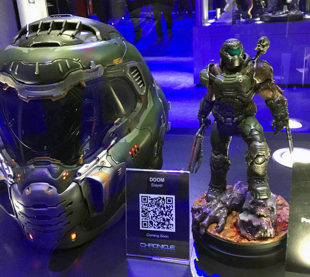 La première figurine dévoilée (photo juste au-dessus) sera dédiée au Doom Slayer du nouveau DOOM Eternal prévue en novembre prochain. À noter que celle-ci dispose d’un socle nettement plus fourni que toutes les autres figurines de la collection avec un monstre écrasé à la American History X. Sinon au passage on a également la confirmation que ce sera une nouvelle fois Chronicles Collectible (après le casque de Fallout 76) à la production du casque inclus dans l’édition collector d’où sa présence a côté de la figurine sur le stand.