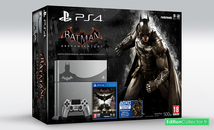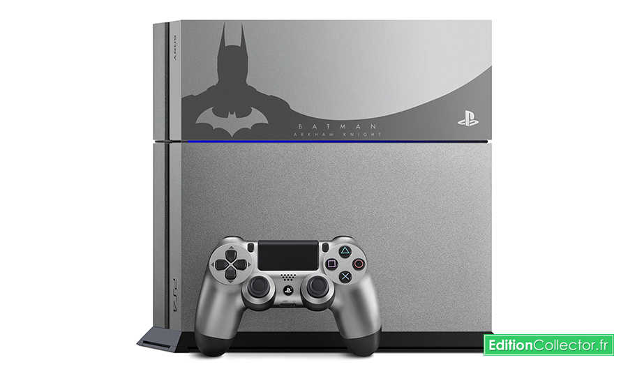 Encore une fois repoussé de quelques semaines supplémentaires au 23 juin prochain, le très attendu Batman Arkham Knight bénéficiera à l’occasion de sa sortie cet été d’une toute nouvelle version exclusive de la PlayStation 4. Et cette fameuse PS4 coloris Steel Grey en édition limitée sera habillée d’une superbe ombre chinoise de Batman sur la partie supérieure. Uniquement disponible en pack, on trouvera donc pour accompagner la console une manette DS4 du plus bel effet dans cette couleur ainsi que le jeu Batman Arkham Knight en Blu-ray, s’il vous plaît ! Mais pas seulement puisque un DLC exclusif Le Cauchemar de l’Épouvantail sera également de la partie avec trois missions supplémentaires se déroulant alors qu’une éclipse solaire plonge Gotham dans l’obscurité. Prévue le même jour que le jeu, à savoir le 23 juin prochain, cette édition limitée Batman Arkham Knight de la PS4 n’est pour l’instant pas encore disponible en pré-commande. Mais cela ne devrait vraiment plus tarder étant donné qu’Amazon a déjà préparé une fiche produit où on s’attend à voir le pack autour des 450€. Comme d’habitude, la Fnac et Micromania suivront d’ici quelques jours, mais bien sûr je vous tiens au courant dès qu’il sera disponible.