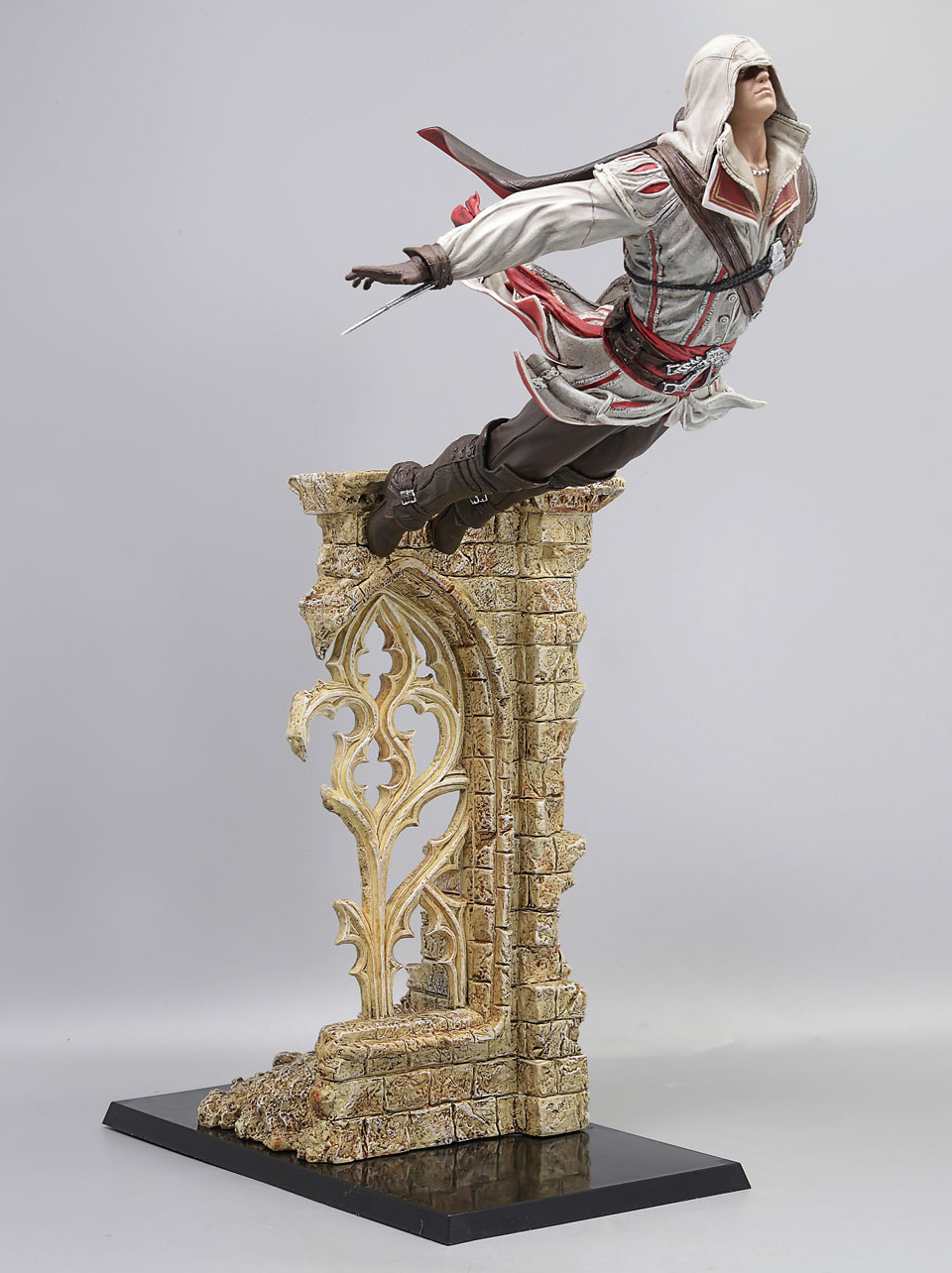 Vraiment très impressionnante, la figurine proposera pour la première fois la reproduction du mythique Saut de la Foi des Assassins. Autant dire que le socle doit faire son poids afin de permettre à Ezio de défier les lois de la gravité !
