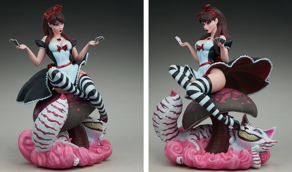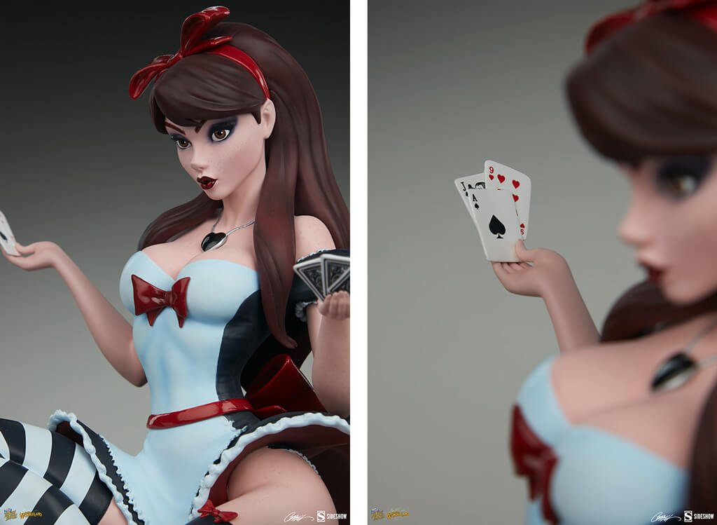 Description éditeur : Méticuleusement sculpté pour traduire le style largement adoré de J. Scott Campbell en une œuvre d'art en polyrésine tridimensionnelle, le portrait brune d'Alice capture à la fois sa beauté et sa surprise alors qu'elle tombe au pays des merveilles, décorée d'un schéma de maquillage plus sombre composé de lèvres rouges profondes et de fumée les yeux. Sa robe noire et blanche et ses bas de cuisse rayés sont finis avec des accents rouges qui ajoutent une touche de la couleur préférée de la reine à son look et donnent une touche pin-up mise à jour à ce personnage classique.