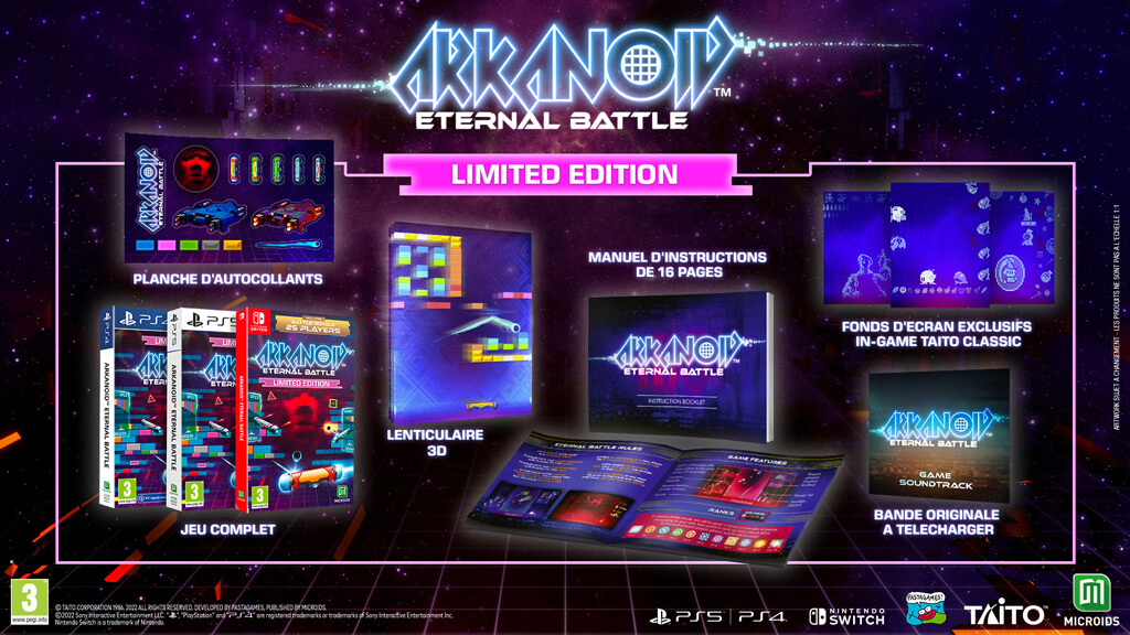 - Néo : ce mode solo vous invitera à (re)découvrir le gameplay classique d’Arkanoid dans une toute nouvelle version proposant notamment des niveaux 100% inédits, une direction artistique et sonore modernisée, mais aussi de nouveaux éléments de gameplay comme de nouveaux blocs, bonus et effets !