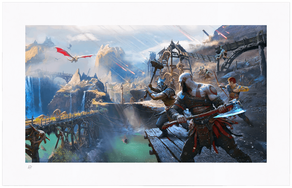 Description : « L'évasion de Týr » est l'illustration conceptuelle officielle du jeu vidéo d'action-aventure God of War Ragnarök, réalisé par Sony Santa Monica Studio (Californie, États-Unis), sorti en 2022. Cette édition limitée Certified Art Giclee™ fait partie de l'impression officielle God of Collection d'œuvres d'art War Ragnarök par Cook et Becker et Santa Monica Studio. L'impression est numérotée à la main et est accompagnée d'un certificat d'authenticité.