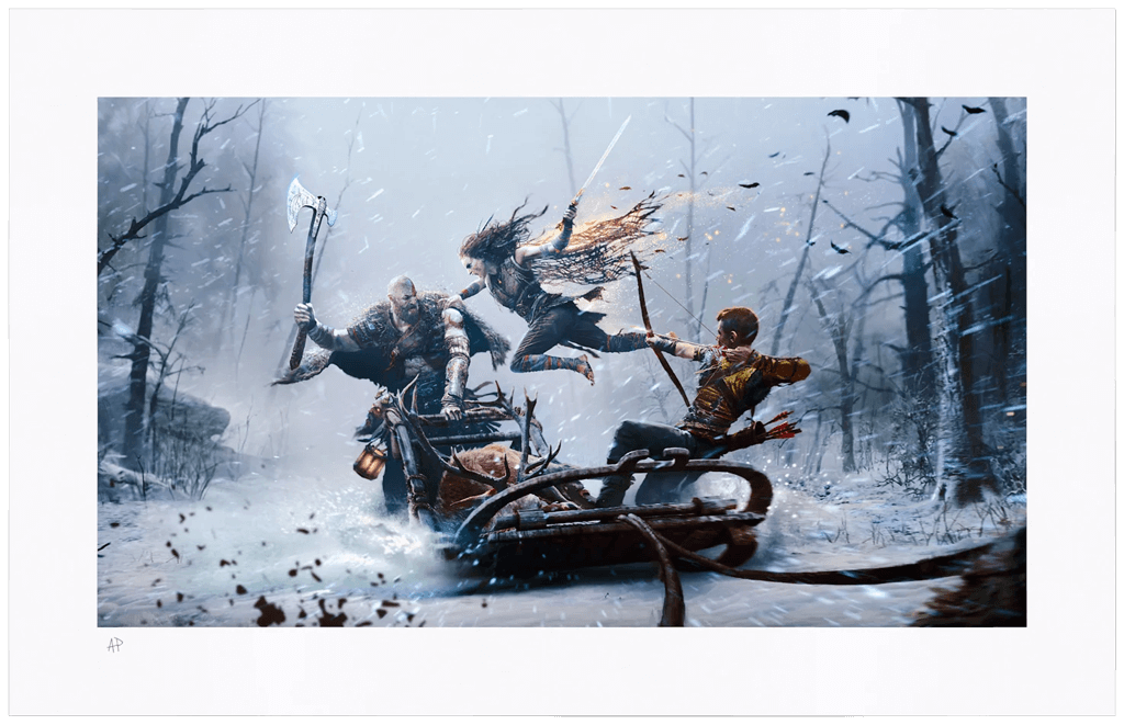 Description : « La poursuite de Freya » est l'illustration conceptuelle officielle du jeu vidéo d'action-aventure God of War Ragnarök, réalisé par Sony Santa Monica Studio (Californie, États-Unis), sorti en 2022. Cette édition limitée Certified Art Giclee™ fait partie de l'impression officielle God of Collection d'œuvres d'art War Ragnarök par Cook et Becker et Santa Monica Studio. L'impression est numérotée à la main et est accompagnée d'un certificat d'authenticité.