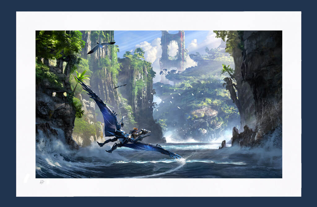 Description : "Wings of The Ten" est l'illustration conceptuelle officielle d'HORIZON FORBIDDEN WEST. Cette édition limitée Certified Art Giclée ™ fait partie de la collection officielle d'art Horizon Forbidden West de Cook and Becker and Guerrilla. L'oeuvre est numérotée à la main et accompagnée d'un certificat d'authenticité.