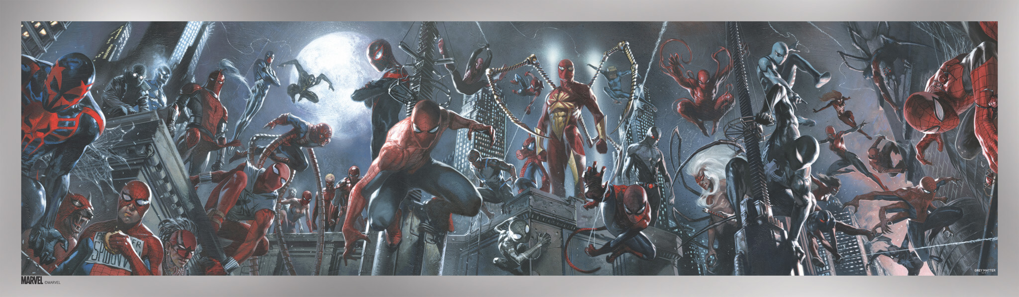 Description éditeur : Le point de vue de Gabriele sur le Spider-Verse est si vaste qu'il a dû être divisé en six couvertures distinctes juste pour tout assembler. C'est impressionnant de voir les 6 couvertures alignées ensemble, mais quand vous la voyez dans son intégralité comme une œuvre d'art complètement connectée, c'est quelque chose de complètement différent, un chef-d'œuvre cohérent ! L'Amazing Spider-Man # 9-14 Foil Variant de Gabriele Dell 'Otto est présenté dans une giclée d'art tentaculaire de 92cm de long imprimée sur du papier métallique argenté avec des encres d'archives que les fans et les collectionneurs peuvent accrocher sur leur mur et admirer !