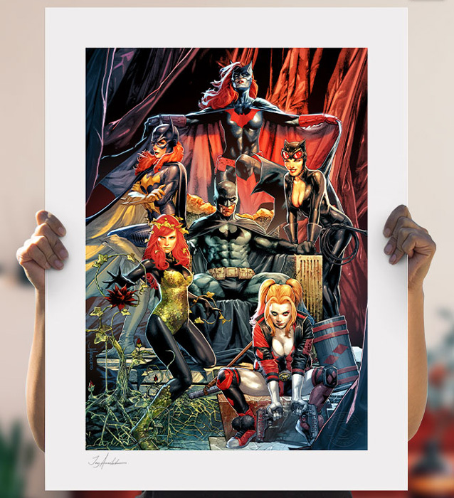 Description éditeur : Après 80 ans sur la scène, Batman est un roi de la bande dessinée, alors l’illustrateur Jay Anacleto assied le chevalier noir sur un trône entouré des femmes les plus puissantes de Gotham. Tout en haut, Batwoman écarte sa cape cramoisie large, encadrant Catwoman et Batgirl alors qu’elles flanquent Batman de chaque côté. Poison Ivy et Harley Quinn s’accroupissent au pied du trône, des fleurs et des armes à feu prêtes à protéger le meilleur héros de Gotham. Créée à l’origine en tant que couverture de variante exclusive pour Batman : Detective Comics #1000, un numéro historique célébrant les 80 ans de Batman dans DC Comics, cette illustration de bande dessinée très détaillée est maintenant disponible pour les fans en tant qu’œuvres d’art à collectionner exclusivement via Sideshow.