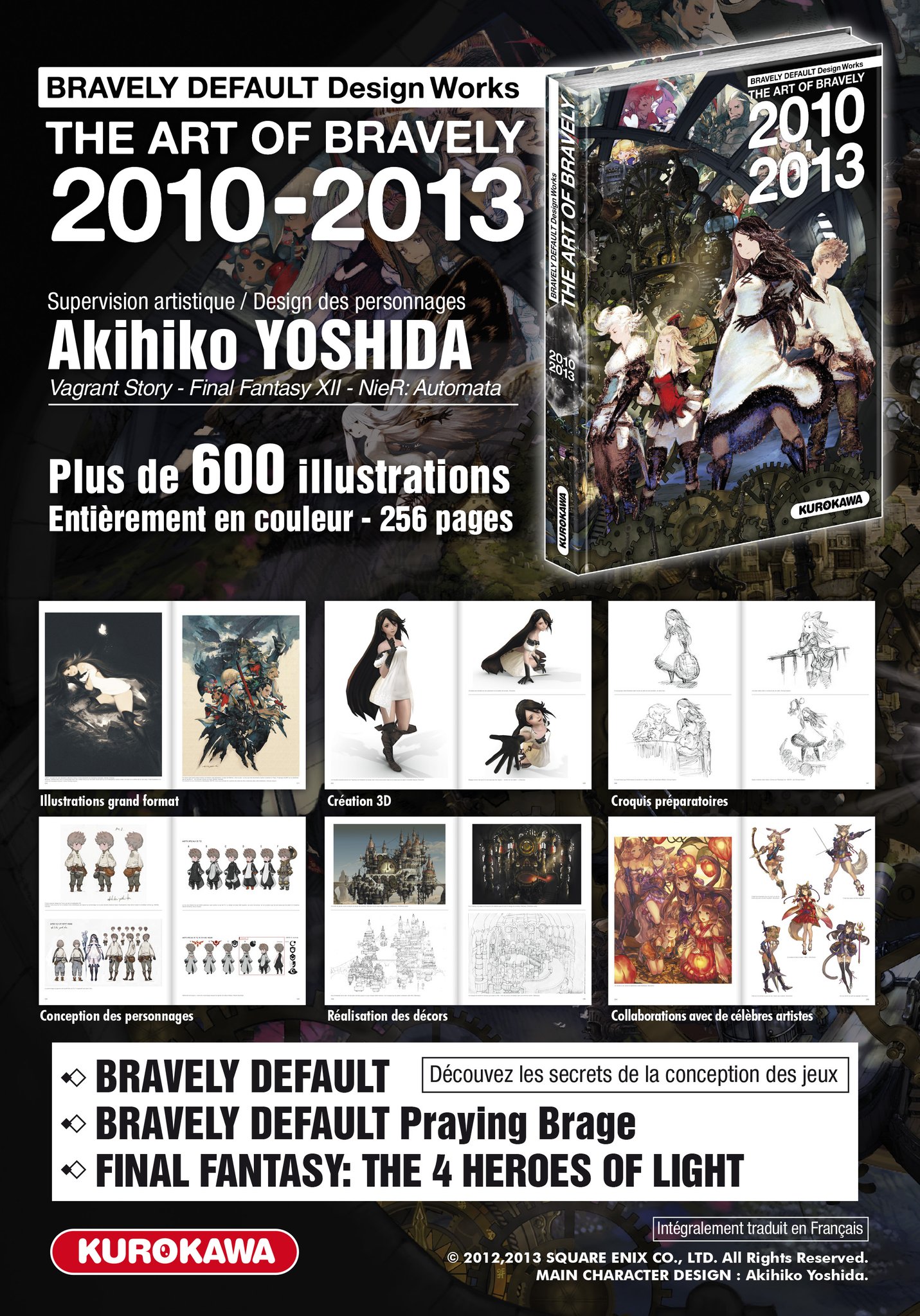 Description éditeur : Ses 256 pages contenant plus de 600 illustrations en couleur vous dévoileront tout ce qu’il y a à savoir sur la conception des jeux Bravely Default (Flying Fairy et For the Sequel), Bravely Default Praying Brage et Final Fantasy : the Four Heroes of Light. Sous la supervision artistique de Akihiko YOSHIDA, qui en est aussi l’illustrateur principal, de nombreux artistes, comme Hideki Ishikawa,Take, Makoto Tsuchibayashi ou Fuji Choko, ont collaboré pour créer ses magnifiques visuels ! Un beau cadeau à faire à tous les amateurs de RPG et de beaux ouvrages !