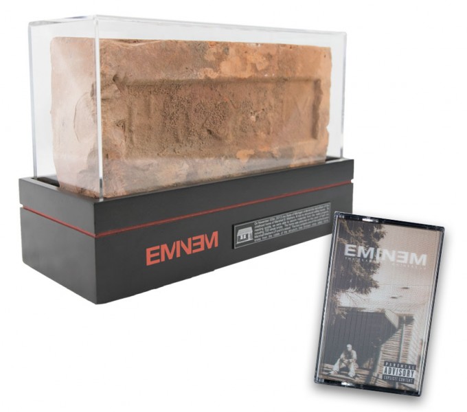 Posséder votre morceau d’histoire avec une brique authentique des restes sauvés de la maison d’enfance d’Eminem présente sur la pochette de the Marshall Mathers LP et sa suite. Chacune des 700 briques est livrées avec un certificat d’authenticité numéroté avec signature manuscrite d’Eminem, protegé par une cloche en plexiglass qui dispose d’une plaque commémorative sur le côté. L’ensemble dispose d’un emballage noir élégant avec des illustrations personnalisées et une description du projet.