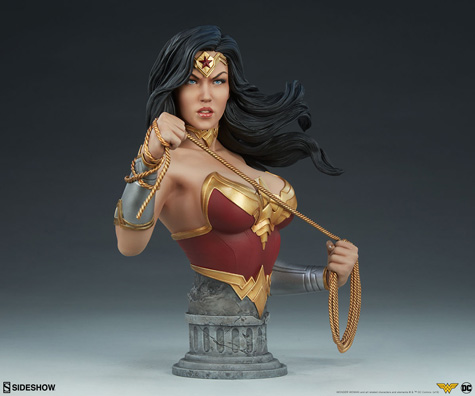 Description éditeur : Le buste en polyrésine de Wonder Woman reproduit la guerrière amazonienne avec son Lasso de vérité à la main. Comme on le voit à partir de la taille, Diana de Themyscira est vêtue de son costume emblématique: corsage rouge sculpté, armure et diadème dorés, et bracelets de soumission en argent. Le lasso de la vérité est également entièrement sculpté, détaillé pour imiter l’apparence de la corde telle qu’elle la manie contre l’injustice à travers l’univers de DC. Assis au sommet d’une base inspirée des piliers Themysciran, ce buste détaillé reflète le dévouement féroce de Wonder Woman à l’amour et à l’honneur dans un monde dangereux.