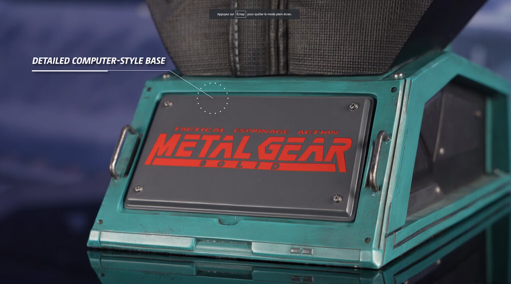Ce buste Solid Snake est une recréation réaliste du mercenaire légendaire lui-même, des traits et détails anatomiquement précis du visage aux traits et mèches de ses cheveux, en passant par les textures et les coutures de son bandana et de son costume. Le design de la base est inspiré des ordinateurs en métal trouvés dans le jeu Metal Gear Solid et a des effets d'altération sur celui-ci pour refléter les conditions militaires difficiles dans lesquelles il a été. Le panneau avant est l'écran de l'ordinateur et est livré avec quatre designs uniques pour l'édition exclusive : le logo Metal Gear Solid, la biographie de Solid Snake telle qu'elle apparaît dans le jeu et deux concept arts de Solid Snake !