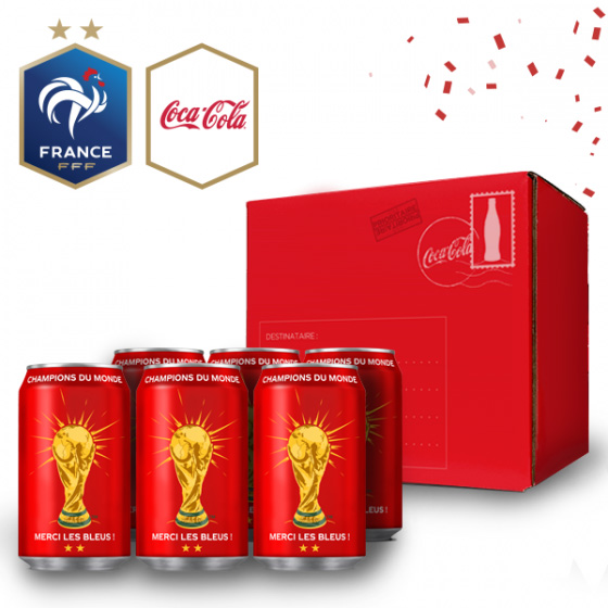 Description éditeur : Découvrez nos canettes Coca-Cola Collector pour la victoire de l’équipe de France à la Coupe du Monde de la FIFA, Russie 2018. Ce coffret collector de 6 canettes sera livré gratuitement chez vous !