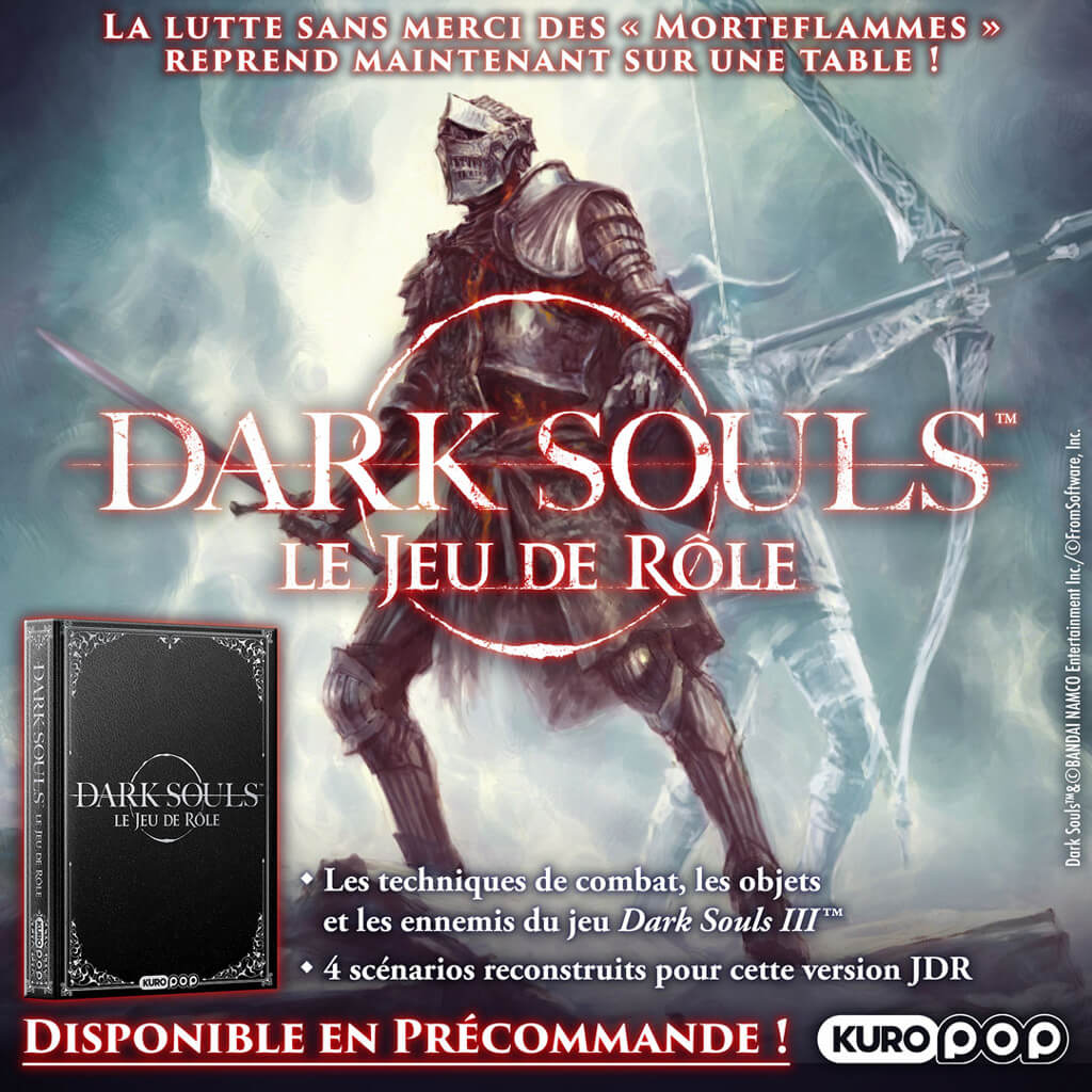 Description éditeur : La lutte sans merci des "Morteflammes" reprend maintenant sur une table ! Retrouvez toute la tension et les obstacles pesants qui font la saveur de la série Dark Souls et la joie de ses joueurs dans un jeu de rôle sur table. Devenez une " Morteflamme " et plongez-vous dans un combat sans fin pour survivre ! Munissez-vous d'un crayon, de dés, créez votre personnage et partez avec vos amis pour une aventure dans un univers rempli de dangers !