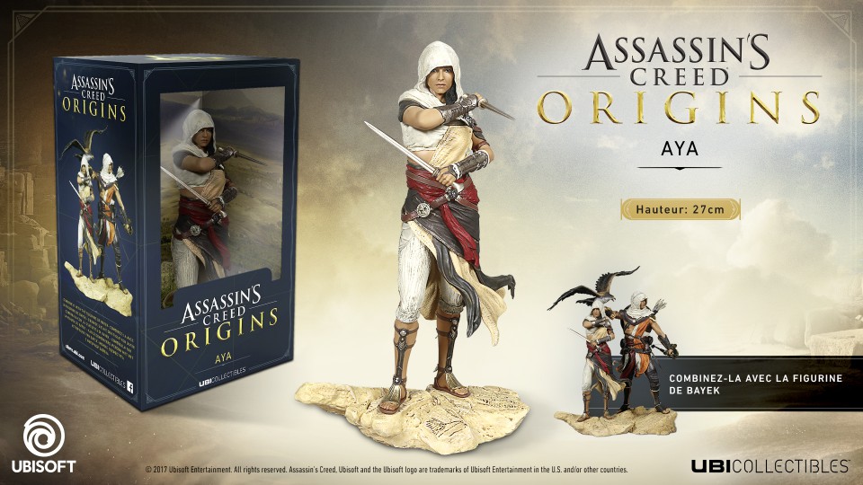 Description éditeur : Découvrez Aya, une femme à l’esprit aussi affûté que les armes qu’elle manie. La figurine présente la combattante égyptienne dans une pose traduisant son style de combat spécifique, armée de deux lames. Née à Alexandrie, Aya est ensuite venue s’installer à Siwa, où elle a rencontré Bayek et est devenue son épouse. Des événements personnels l’ont poussée à revenir à Alexandrie, où son esprit vif n’a pas tardé à attirer l’attention de certains des personnages les plus influents de la ville…