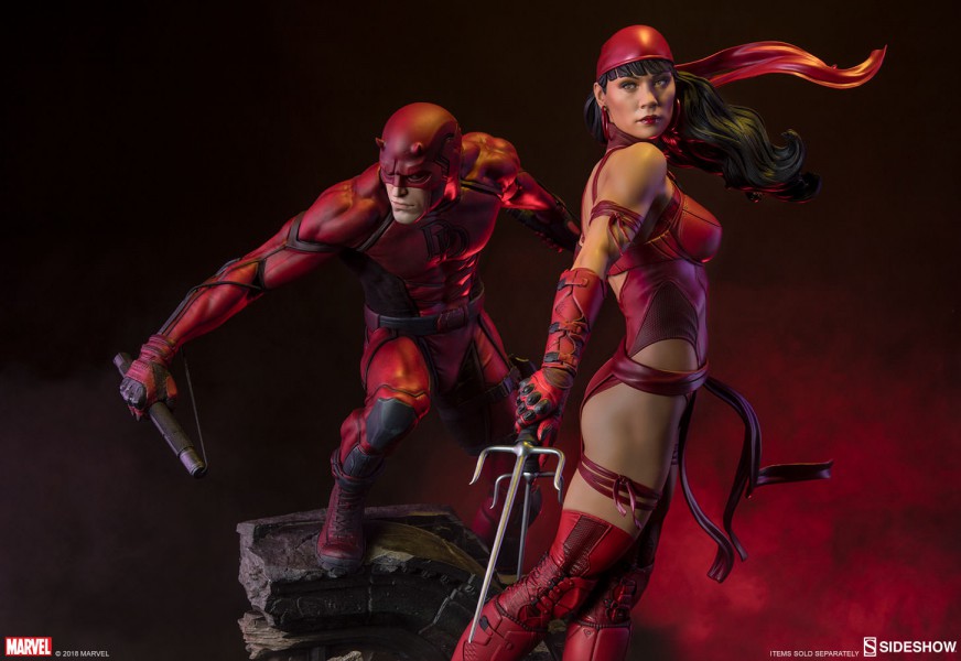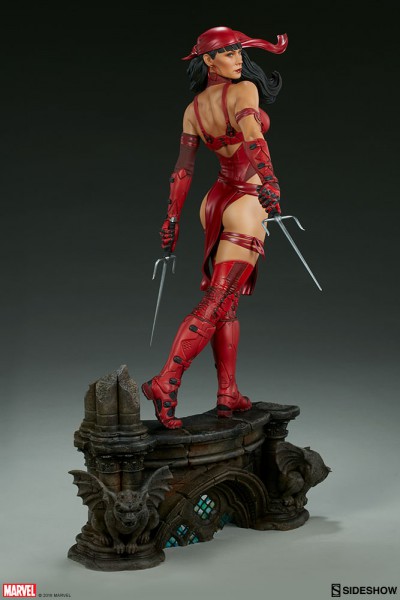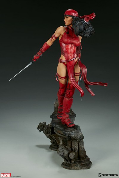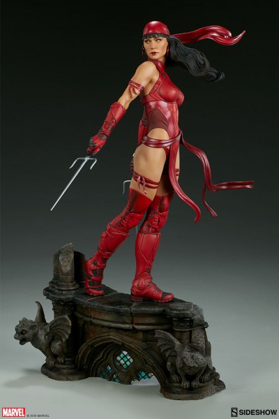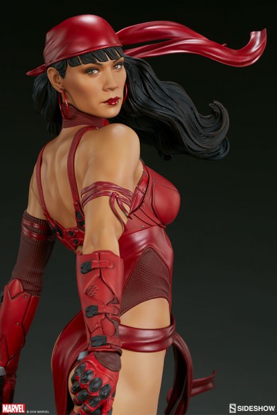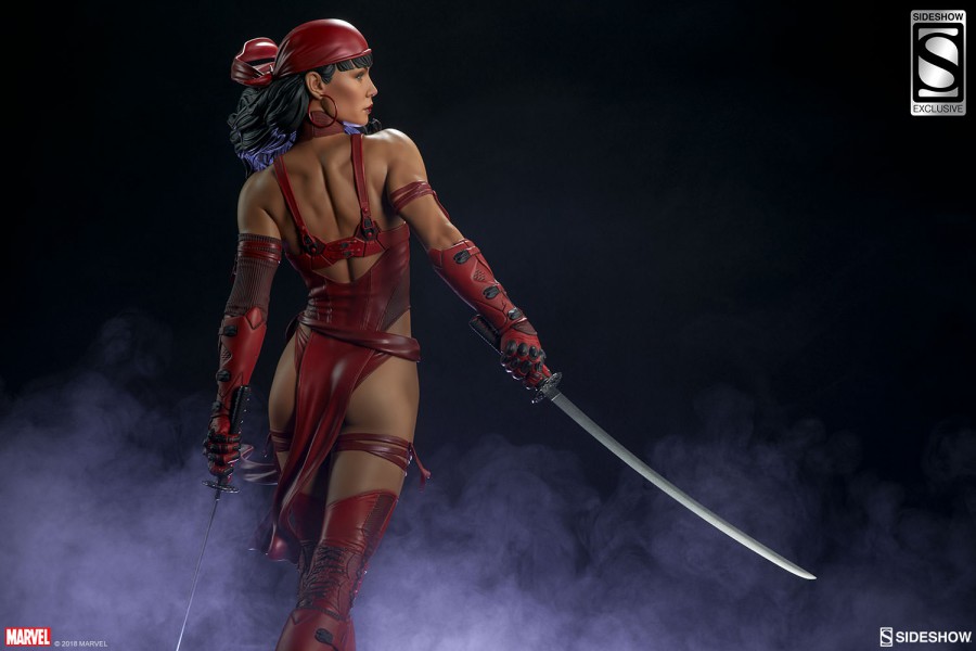 Description éditeur : La figurine Premium Format d’Elektra est dotée d’un costume rouge entièrement sculpté qui réinterprète son look classique. La fameuse assassine porte des gantelets détaillés, des bottes et un body tout avec une apparence tactique et blindée sculptée dans du polystone. Le portrait détaillé d’Elektra capture sa beauté dangereuse, avec des boucles d’oreilles rouges, des cheveux noirs fluides, et son bandana rouge caractéristique flottant de façon spectaculaire. Elle est équipé de ses fameuses épées en métal et comprend un autre bras droit surélevé pour une option d’affichage supplémentaire. L’édition exclusive de la figurine Elektra comprend une paire de mains interchangeables contenant des katana en métal. La main droite peut donc être attachée au bras alternatif pour une option d’affichage mortelle supplémentaire.