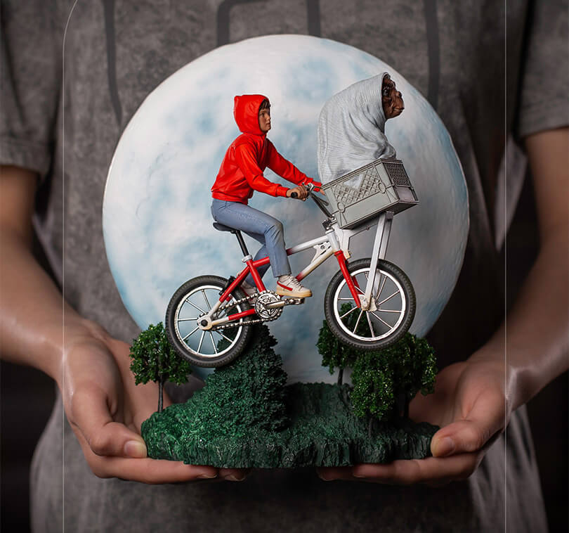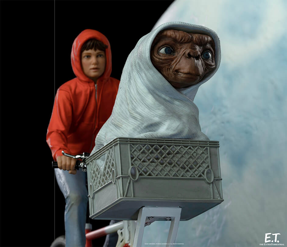 Description éditeur : Cette scène anthologique, qui a la lune en toile de fond, a également été utilisée dans la promotion du film, devenant l'une des images les plus connues et les plus marquantes du cinéma, devenant même le logo d'Amblin Entertainment (le studio de Steven Spielberg) est maintenant aussi fièrement répliqué avec la statuette résine par Iron Studios !