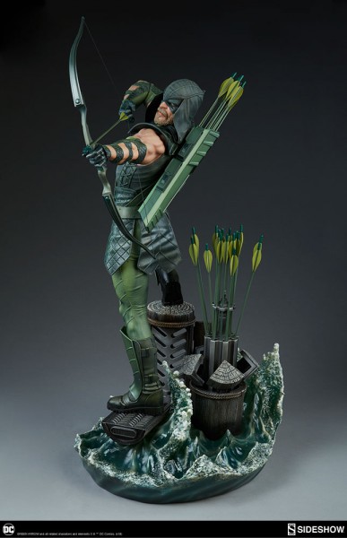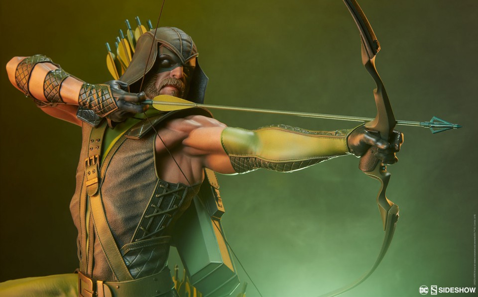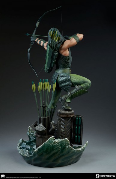 Description éditeur : La figurine Green Arrow Premium Format présente un costume complexe sculpté, détaillé avec une variété de textures réalistes pour imiter l’apparence et le mouvement d’un uniforme de vigilante dynamique, y compris des épaulières, une tunique d’émeraude et un pantalon. Il a un physique sculpté athlétique et est équipé de protège-bras de tir à l’arc, ainsi que d’un carquois bien garni dans son dos. Le portrait moderne à capuche de Green Arrow avec un masque de domino vert et sa barbe soignée donne à Oliver Queen un air de mystère alors qu’il vise avec intention sa prochaine cible. L’édition exclusive de Green Arrow comprend un portrait classique alternatif, avec sa casquette verte à plumes et sa fameuse moustache et barbiche. Libérez l’arsenal complet d’Oliver Queen avec la flèche de gant de boxe exclusive supplémentaire, vous donnant une option d’affichage supplémentaire pour l’archer d’as.