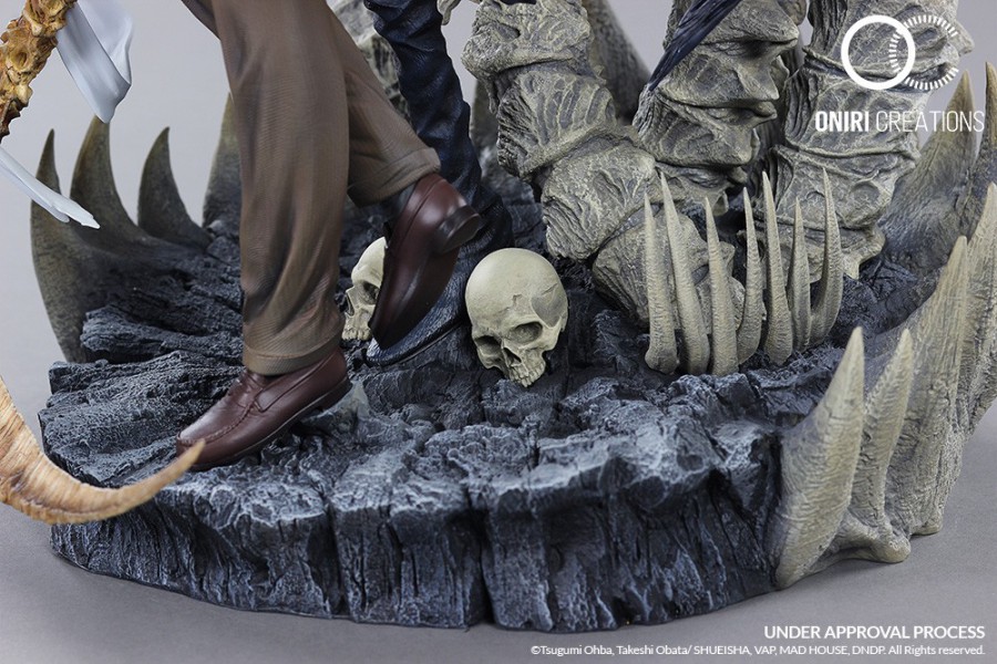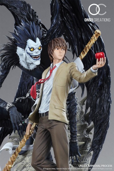 Description éditeur : La statue représente le personnage de Light tenant une faux et accompagné de Ryuk, le dieu de la mort qui garde un œil attentif à l’utilisation que Light va faire du Death Note. Le socle qui représente le monde Shinigami et les couleurs utilisées accentuent le côté sombre de la statue. La statue est fournie avec 2 mains interchangeables pour Light, l’une tenant le Death Note et l’autre tenant une pomme rouge. Le diorama fourmillant de nombreux détails est réalisé en résine à l’échelle 1/6.