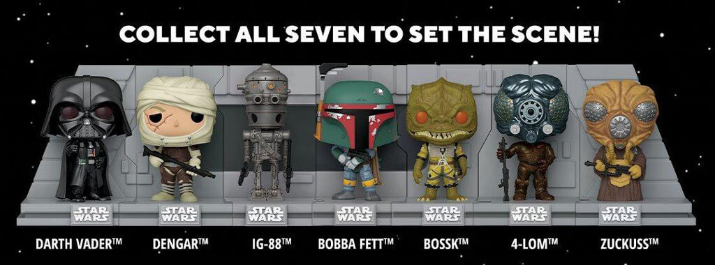 Description éditeur : Cette nouvelle collection de figurines Funko pop, présente la galerie emblématique des chasseurs de primes commandés par Dark Vador pour traquer le Faucon Millénium !