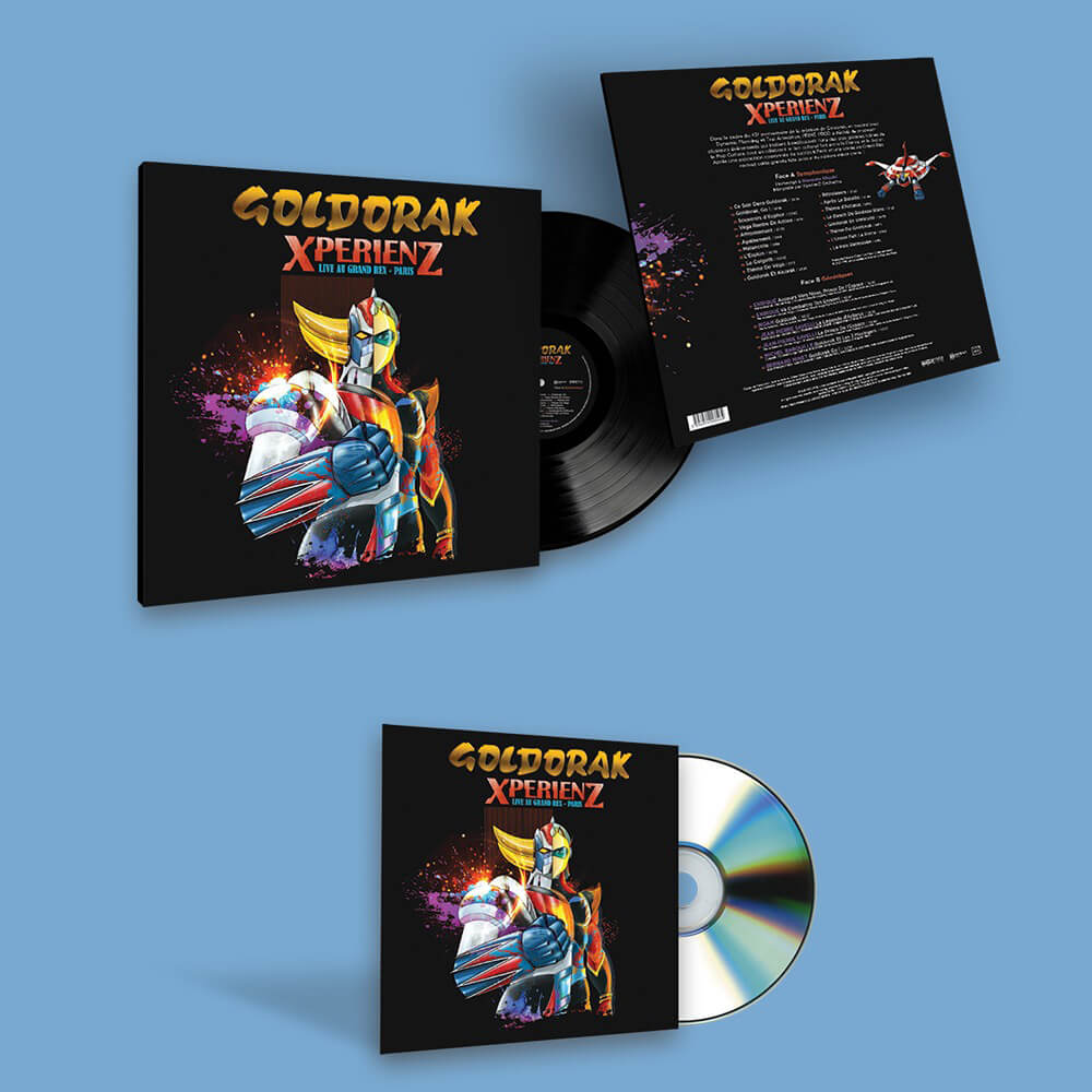 Description éditeur : Pour la première fois, retrouvez dans un coffret inédit les rééditions des deux vinyles emblématiques de Goldorak, un vinyle et un CD exclusif du live au Grand Rex ainsi que 6 fan arts aux dimensions de 30 cm x 30 cm reprenant les pochettes des 45 tours originaux.