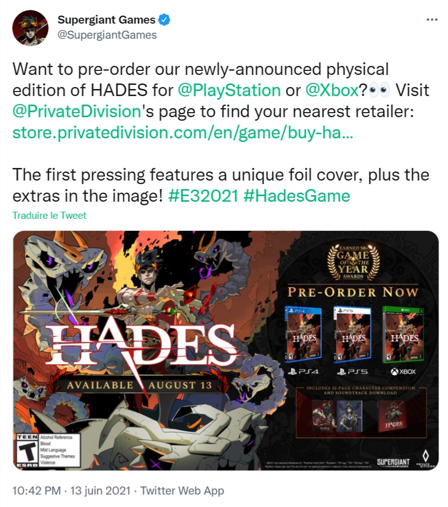 L'édition physique de Hades sur PS5, PS4 et Xbox (+d'infos sur la fiche du blog) est en promo à 16€ sur Amazon au lieu de 30€ !