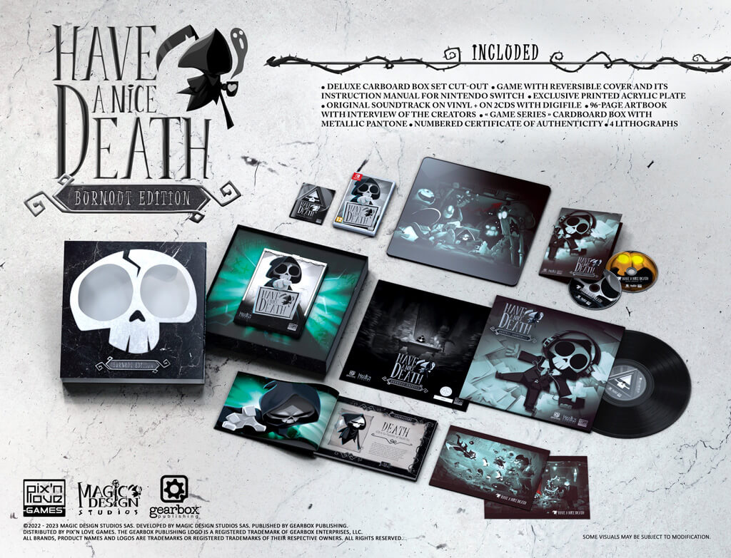 Comme prévu, l'édition Burnout numérotée à 500ex du jeu Have a Nice Death sur Switch est maintenant dispo en précommande à 150€ sur Pix'n Love