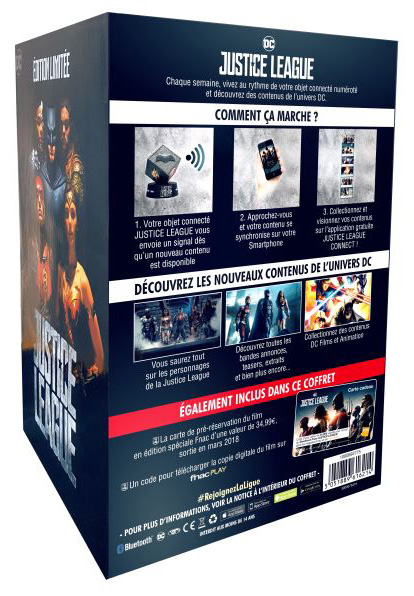 Pour rappel, celui-ci renferme une carte cadeau de 35€ pour l’achat du steelbook spécial Fnac l’année prochaine ainsi qu’un objet connecté en forme de cube avec les logos de Batman, Superman, Wonder Woman Aquaman, Cyborg et Flash. Ces derniers s’allument et envoient simplement des notifications dès qu’un nouveau contenu exclusif est disponible depuis l’application Justice League connect.