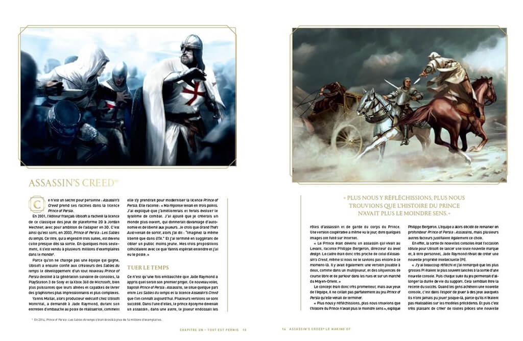 Description éditeur : Assassin’s Creed, ce jeu vidéo à succès qui, depuis son premier opus a séduit des millions de fans et donné naissance à un univers mythique, fête ses 15 ans. Chacun de ses opus plonge les joueurs dans une période fascinante de l’Histoire – Jérusalem au temps des croisades, la Renaissance italienne, la guerre de Sept Ans, l’âge d’or de la piraterie, la Révolution française – et les emmène sur les traces de personnages aussi importants que Léonard de Vinci, Robespierre ou Richard Cœur de Lion. Grâce à cet ouvrage où l’illustration se fait la part belle, découvrez la genèse du jeu et de chacun de ses opus, leur graphisme d’exception, les secrets qui ont présidé à leur création, et la façon dont ils ont évolué sans jamais perdre leur identité visuelle et leur cohérence. Enrichi des témoignages des développeurs d’Ubisoft, ce livre offre un aperçu extrêmement complet d’un des plus beaux jeux du XXIe siècle.