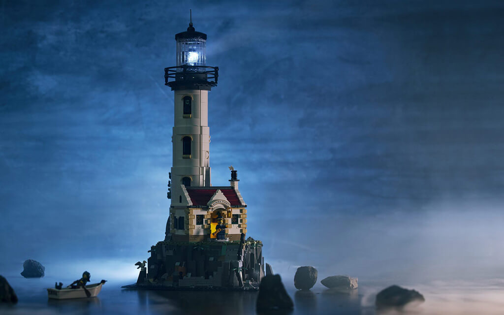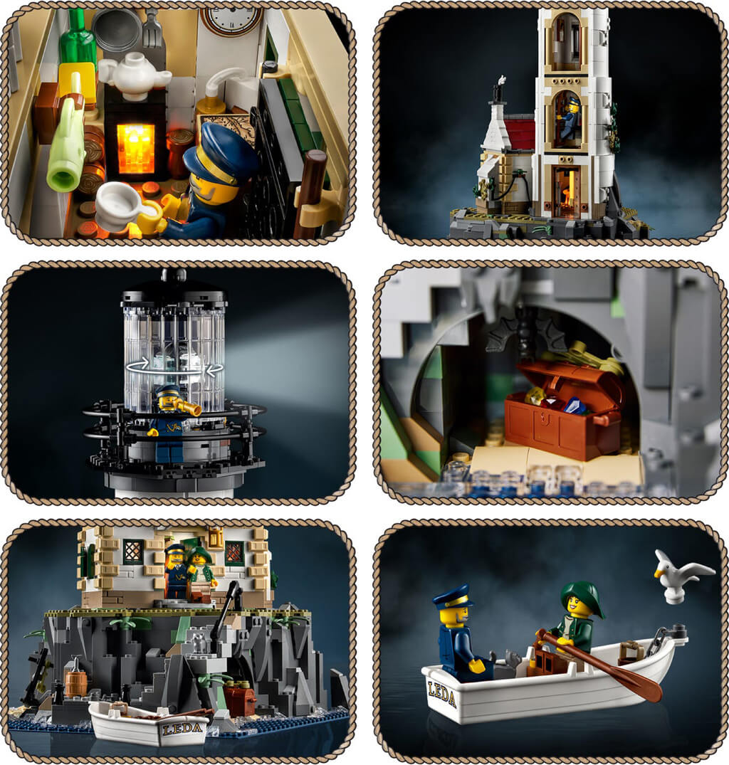 Description éditeur : Faites briller votre créativité en construisant Le phare motorisé LEGO® Ideas (21335) incluant un faisceau lumineux rotatif motorisé et une lentille de Fresnel personnalisée, ainsi qu’une petite maison avec un feu dans la cheminée. Les bâtiments construits sur un rocher sont facilement accessibles pour admirer les intérieurs superbement détaillés. Des marches permettent d’accéder à la jetée et à une grotte contenant un trésor de pirate. Les minifigurines du gardien et d’un marin, ainsi qu’un canot à rames, une mouette et un chat complètent la scène pittoresque.