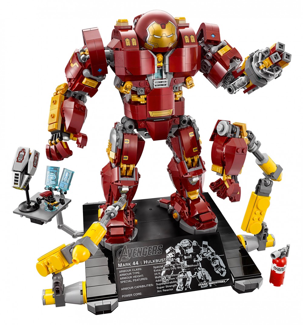 Description éditeur : Ce modèle du robot Hulkbuster est muni d’un torse rotatif, de doigts, de bras, de jambes et de pieds articulés et d’éléments phosphorescents. Ce set comprend deux bras gauches interchangeables, dont le bras marteau-piqueur avec fonction coup de poing, et une brique lumineuse située sur la poitrine. Inclut également une plaque d’exposition et une nouvelle minifigurine Iron Man !