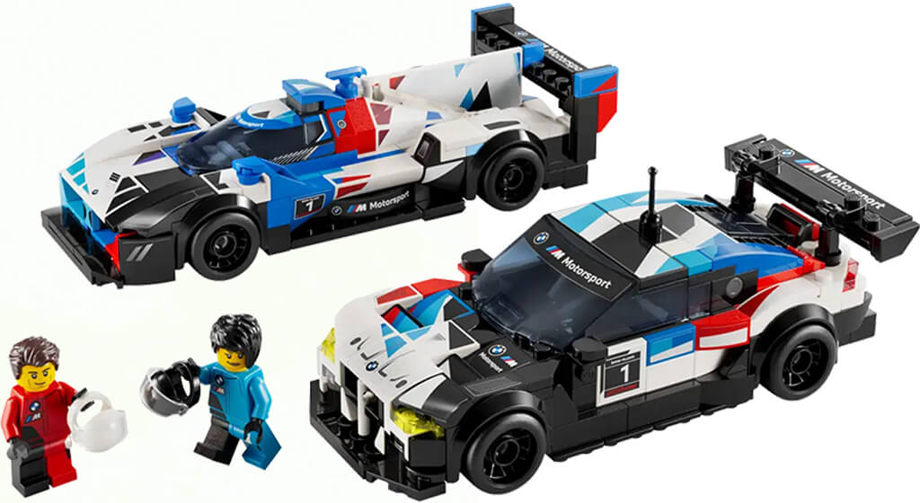 Description éditeur : Les répliques de la BMW M4 GT3 et de la BMW M Hybrid V8 présentent des détails fidèles aux modèles originaux, dont des tuyaux d’échappement, des diffuseurs, des ailerons arrière, la livrée BMW M et des détails intérieurs. Chaque véhicule inclut un toit amovible et une minifigurine de pilote que les enfants peuvent installer à l’intérieur.
