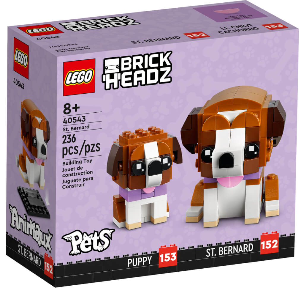 Description : Les amateurs de chiens vont adorer construire et jouer avec ce set LEGO BrickHeadz Les saint-bernards (40543). Les adorables modèles de saint-bernard et de chiot portent d’incroyables colliers roses et ont la langue pendante. Accompagnés de végétation, ils peuvent être exposés sur une plaque de base ou détachés pour favoriser le jeu des enfants à partir de 8 ans.