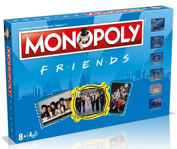Description éditeur : Revivez les meilleurs moments de la mythique série FRIENDS dans cette édition spéciale du Monopoly. Parcourez le plateau avec le Dinosaure de Ross, la Pizza de Joey, ou encore la guitare de Phoebe et retrouvez chez vous l’ambiance qui a fait le succès de la célèbre sitcom ! Le canapé et les tasses du Central Perk remplacent les traditionnels maisons et hôtels.