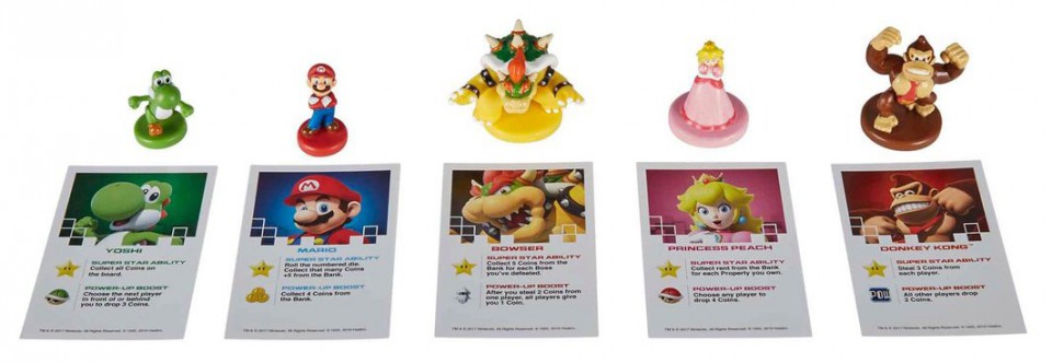 Contenu : Comprend un plateau de jeu, 5 pions représentant des personnages Nintendo (Mario, Princesse Peach, Yoshi et Donkey Kong et Bowser), 5 cartes de personnage, 5 cartes de rappel, 8 cartes Boss, 16 Titles Deed, 1 dé numéroté, 1 dé Power-up, 90 pièces, et les instructions.