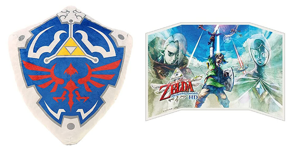 Détails : Au Japon, Amazon offre en exclu une grande peluche bouclier Hylien + un décor dépliable (36 x 22cm) en bonus de pré-commande avec le jeu Zelda Skyward Sword HD !