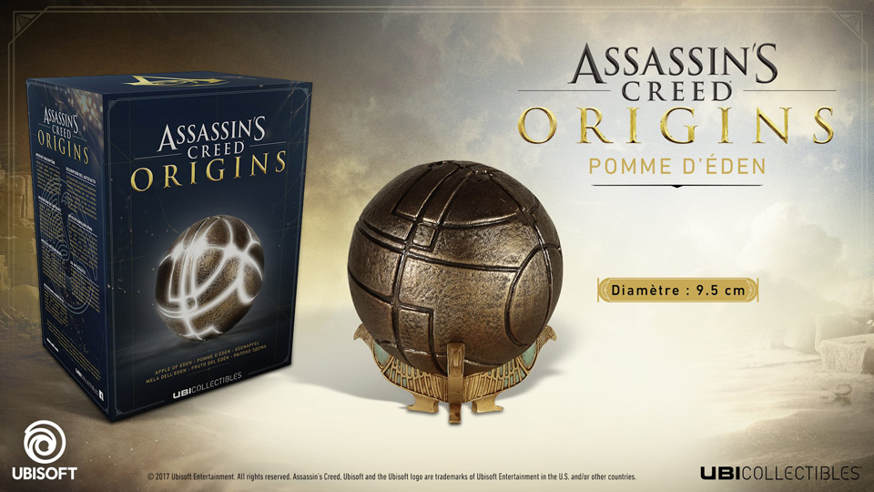 Description ubisoft : Ubicollectibles a le plaisir de vous présenter l’un des artefacts les plus mystérieux de la série de jeux Assassin’s Creed : la Pomme d’Eden. Découvrez cette reproduction officielle de la relique qui sera présente dans Assassin’s Creed Origins. Grâce à son système à LED, cette réplique grandeur nature s’illumine d’une simple pression sur un bouton et repose sur un superbe socle de style égyptien.