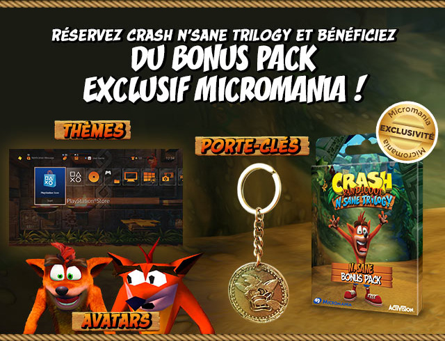 Info supplémentaires : Pour les premiers acheteurs de Crash Bandicoot N.Sane Trilogy (le bonus doit apparaître dans le panier), recevez gratuitement un porte-clefs ainsi que des bonus digitaux exclusivement chez Micromania ! Recevez un porte-clefs, un thème PS4 et des avatars exclusifs.