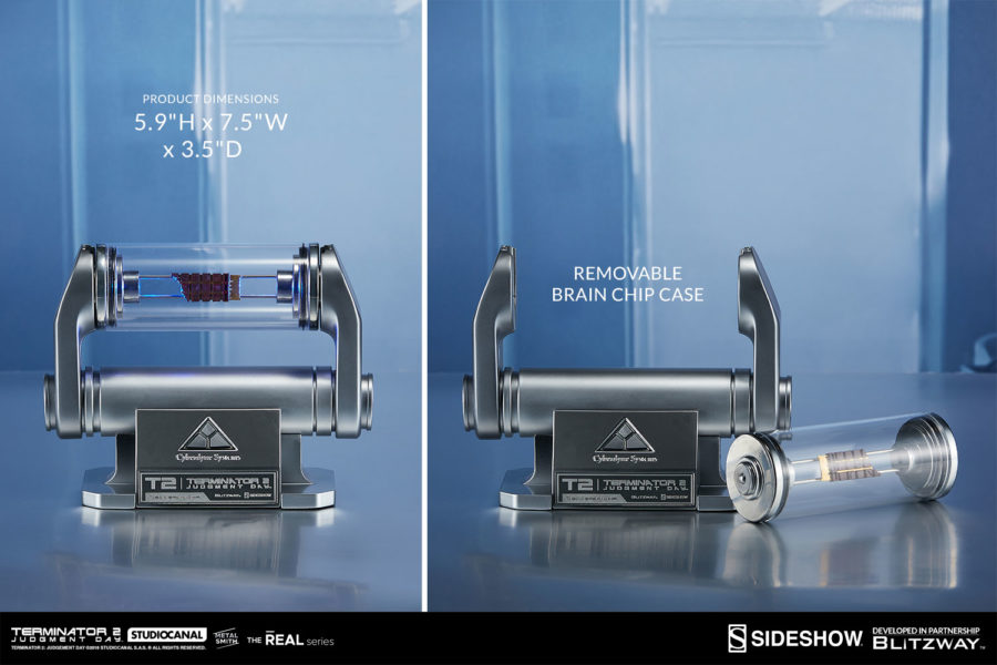 Description éditeur : Blitzway s’est mis au défi de recréer des répliques grandeur nature unique et surréaliste, que tout fan serait fier de posséder dans sa collection personnelle. L’avant bras endosquelette du T-800 identique à la version avec une tonne de détails en plus d’être animé par des mouvements de machine vifs et les sons du film. La puce cérébrale, réinventée ici dans un format de collection comprend des fonctions d’éclairage LED et un présentoir Cyberdyne Systems qui fait office de télécommande pour le bras.