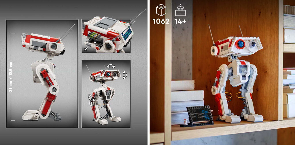 Description éditeur : Les joueurs de Star Wars Jedi : Fallen Order peuvent revivre leurs aventures épiques en construisant puis en exposant cette version LEGO Star Wars du droïde d’exploration BD-1 (75335). La tête du modèle en briques, qui s’incline vers l’arrière, l’avant et sur le côté, fera fondre les fans, de même que les autres détails réalistes, comme les éléments transparents à l’arrière de la tête indiquant l’humeur de BD-1 et le compartiment pour les capsules de Stim. Un écriteau et une figurine LEGO de BD-1 complètent cette charmante pièce d’exposition.
