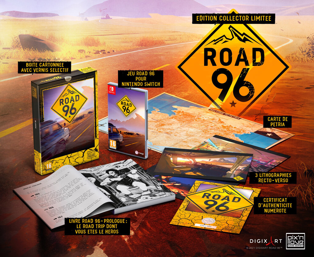 Description éditeur : Road 96 est un road-trip aussi beau que délirant. Votre propre périple vers la liberté, rempli de lieux saisissants et de personnages intrigants. Une aventure narrative en constante évolution, inspirée de Tarantino, des frères Coen et de Bong Joon-ho. Par les créateurs primés de Soldats Inconnus et Memories Retold. De l’action, de l’exploration, des moments contemplatifs, mélancoliques, des aventures humaines et des situations insolites. Le tout sur fond de régime autoritaire et oppressif. Un style visuel époustouflant, une bande-son à base de tubes des années 90, des milliers de chemins différents… Tout contribue pour permettre à chaque joueur de créer ses propres histoires sur Road 96.