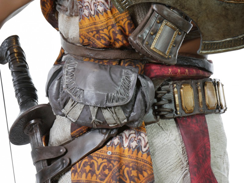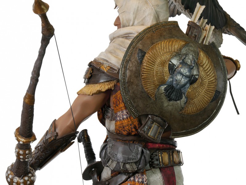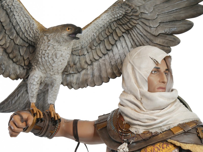 Bayek pourrait tout à fait mesurer 1m80. S’il surmonte un monticule rocheux, et qu’il tient son aigle déployé au dessus de lui, on peut atteindre les 2m20. Les employés d’Ubi ont abusé du Levothyrox en mars dernier, surtout pour dégueuler autant de produits dérivés “collector” pour le prochain Asassin’s Creed. Entre la statue 1:1, la casque Focal en or et le buste en bronze, il y a comme une overdose !