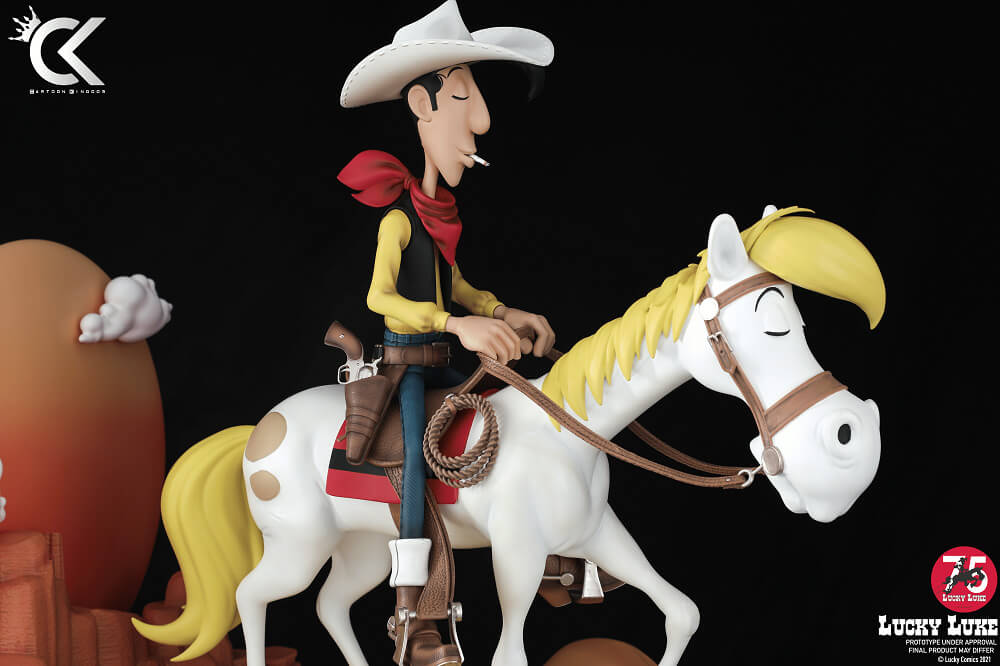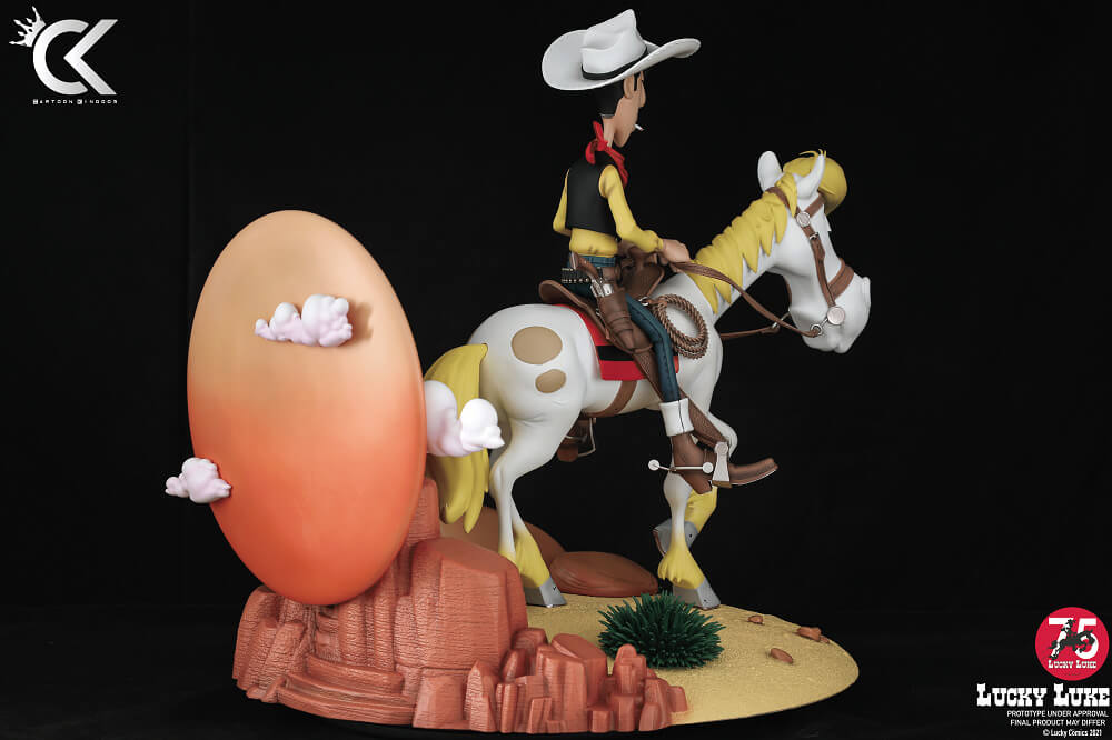 Description éditeur : A l’occasion des 75ans de Lucky Luke, Cartoon Kingdom a voulu commémorer cet anniversaire avec une interprétation de la première case issue de l’album 30 des aventures de Lucky Luke. Il était important d’avoir dans la même case Lucky Luke sur son cheval avec ce fameux coucher de soleil qui ponctue chaque aventure. La tâche la plus ardu était de trouver LA case ou ce soleil était derrière notre héro afin d’avoir une belle vue d’ensemble.