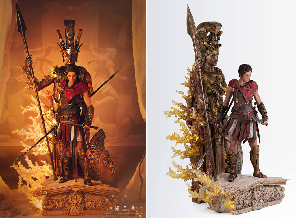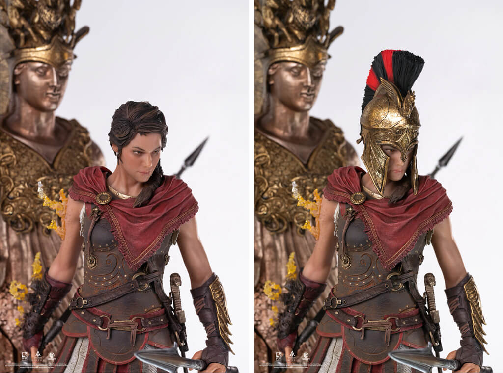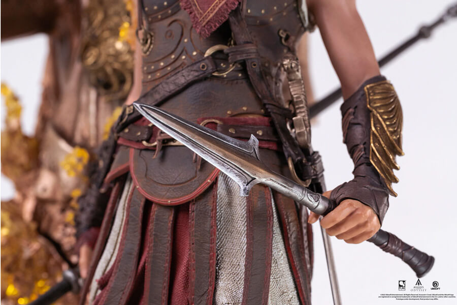 - Sculpture incroyablement détaillée avec une tenue de combat Misthios classique et une lance brisée.