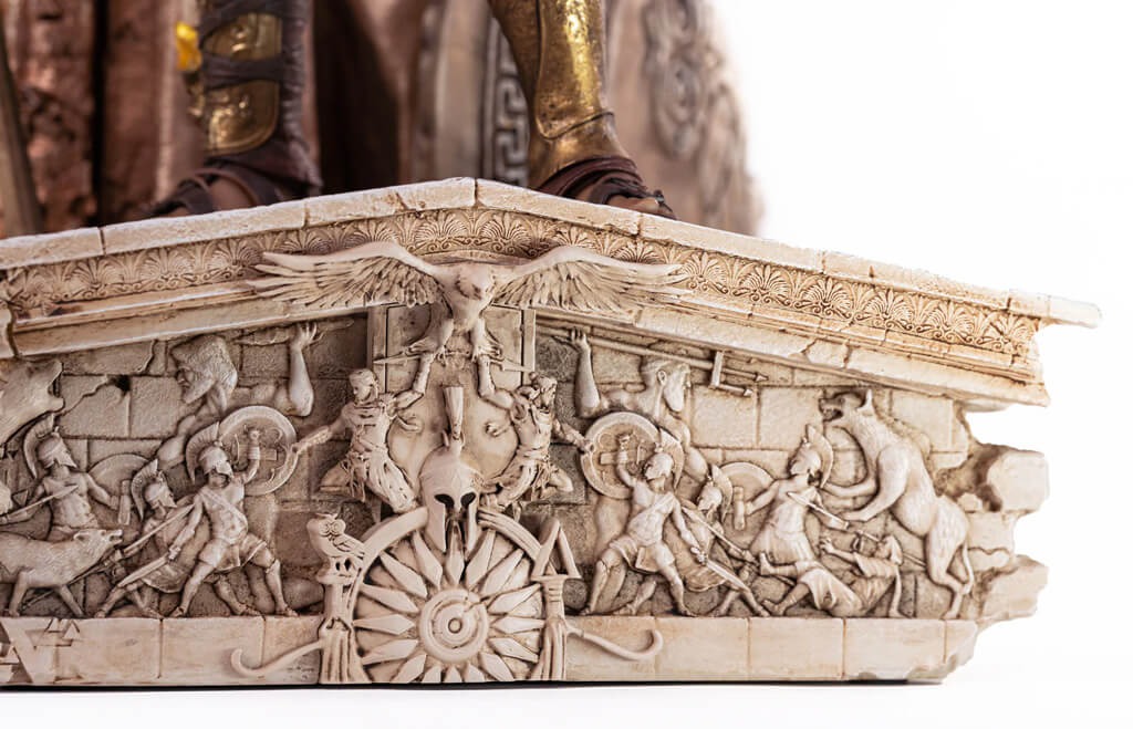 - Base éclairée par LED avec statue d'Athéna de couleur bronze et gravures représentant Alexios au combat