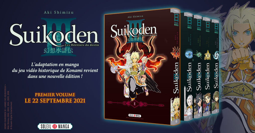 Description éditeur : Retrouvez dans une toute nouvelle édition l'adaptation fidèle en manga du célèbre jeu vidéo RPG de Konami, Suikoden III ! La guerre fait rage depuis des lustres entre les Grasslands et les Zexen. De chaque côté, les jeunes générations sont formées pour défendre leur clan. Victimes de cette guerre fratricide, la frêle Chris et le jeune Hugo devront se battre jusqu'à la mort. Derrière ce conflit se cache cependant la quête des True Rune, conférant à leurs possesseurs des pouvoirs inimaginables.