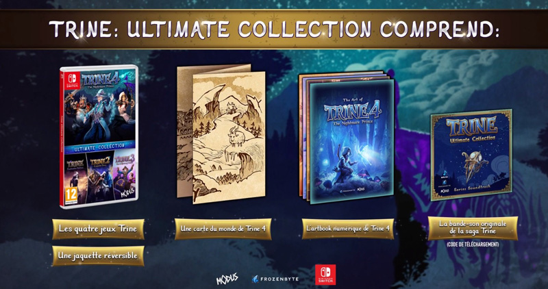 Mise à jour le 10 juillet 2019 : Cette fois c’est confirmé, la version Ultimate Collection de Trine avec les 4 jeux + quelques bonus/goodies sortira également sur Switch ! Et Amazon ne perd pas de temps puisqu’elle est déjà disponible en pré-commande à 50€ comme sur PS4 et Xbox One.