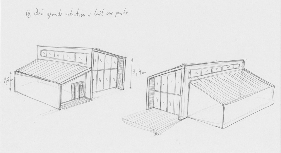 ma premiere idée (en fait c'est la 25eme, mais je vous évite toutes les itérations pour en arriver là XD), c'est la plus simple sur le papier puisque je pose un toit mono pente dans le même genre qu'il y a déjà et je fait de grande belle ouverture pour avoir de la lumière naturel et un peu de chauffage avec les baies vitrées. L’extension, c'est une idée pour pouvoir me faire un super home ciné du tonner plus tard ^-^ (c'est pour ça qu'il n'y a pas de fenêtre XD)